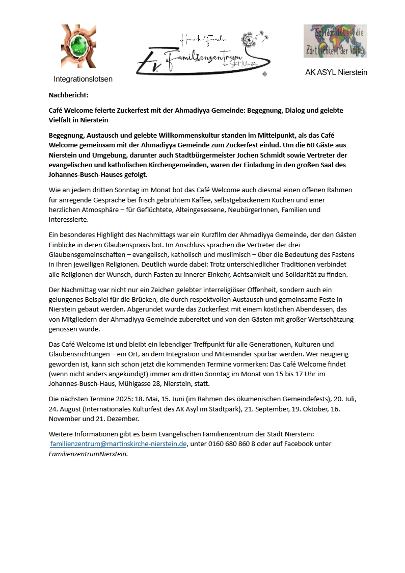 Geplant haben wir auch für 2025 unser Café Welcome an jedem 3.Sonntag im Monat stattfinden zu lassen. Nach wie vor unterstützen uns dabei sehr engagierte Helfer:innen. Freuen würden uns aber sehr über mehr Besucher:innen.